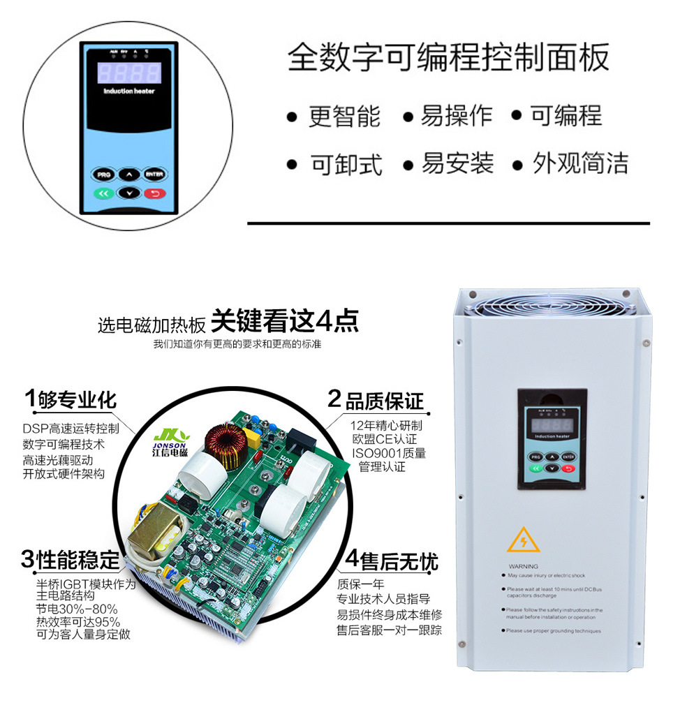 三相10KW/380V、15KW/380V電磁加熱控制器。是本公司研發(fā)的基于本公司第五代DSP控制平臺(tái)的數(shù)字電磁加熱系統(tǒng)。與以往電磁加熱控制板相比,采用全數(shù)字運(yùn)算處理、德國(guó)英飛凌磁驅(qū)動(dòng)、全數(shù)字鎖相跟蹤技術(shù)。具有高性能穩(wěn)定,熱效更高,便于安裝,故障率低的特點(diǎn)。應(yīng)用十分廣泛,外觀美觀、安裝方便,調(diào)試簡(jiǎn)單,應(yīng)用可靠。可廣泛應(yīng)用于采暖、塑料機(jī)械、橡膠設(shè)備、化工、模具、商用電磁爐、各種管道加熱、平面加熱原油輸送等類(lèi)似加熱行業(yè)。